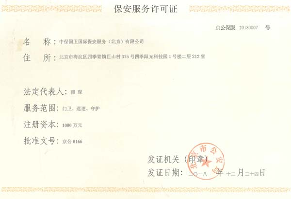 中保國衛(wèi)國際保安服務(北京)有限公司,屬中保國衛(wèi)集團旗下子公司。能全方位的為大型客戶提供優(yōu)質的安保、押運服務,是集人防和技防于一體的新型正規(guī)化綜合安保押運服務企業,提供人防、物防、技防、聯網報*、非武裝押運等安防相關的一站式服務。